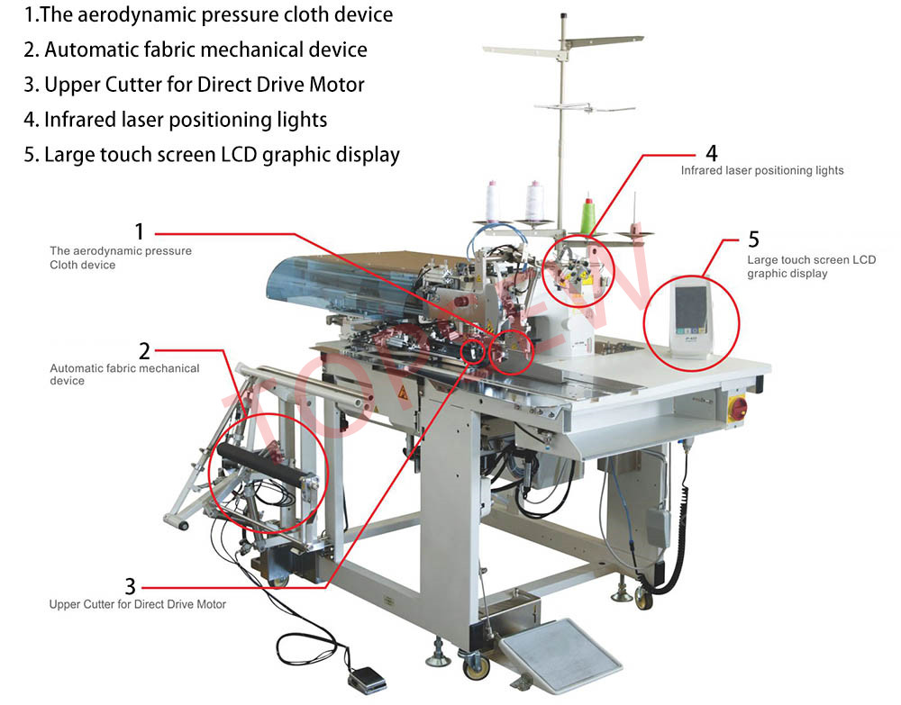 DeAutomatisk lommesymaskine til lige lommer med klapUnderstøtter syning af lige lommer (med flapper) på jakkesæt, jakker og bukser. Dobbelt-/enkeltsyning kan ændres med et enkelt tryk på en knap på betjeningspanelet. Sylængden forlænges (35 mm - 220 mm).